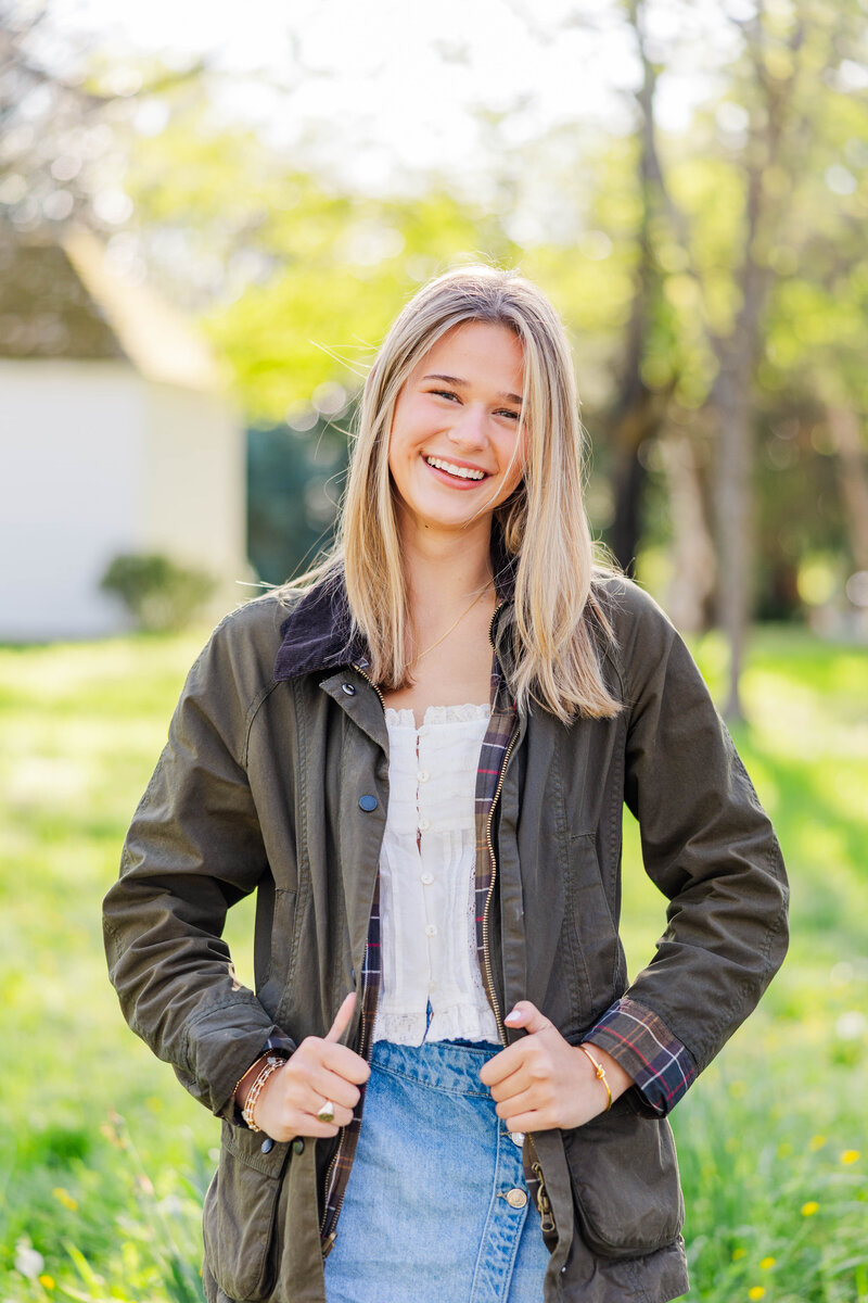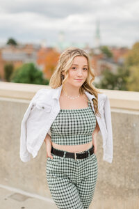 Adding layers to your outfits always looks really great in portraits while also creating a chance for more variety - aka more photos !! A cute top paired with a shacket in the fall, or a dainty tank top paired with a denim jacket makes for great opportunities for posing and adding in "props"!